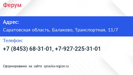 Ферум по адресу Саратовская область, Балаково, Транспортная, 11/7 в дальнейшем Организация, размещена в следующих категориях: