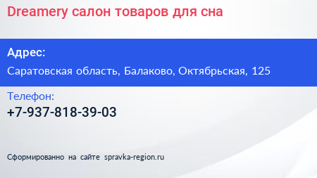 Dreamery, салон товаров для сна по адресу Саратовская область, Балаково, Октябрьская, 125 в дальнейшем Организация, размещена в следующих категориях:
