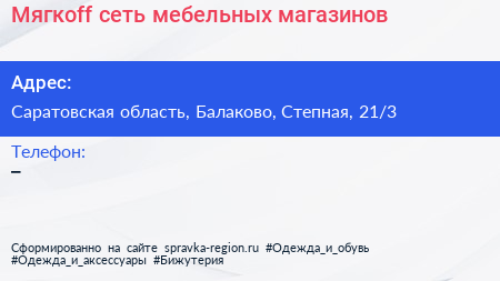 Мягкоff, сеть мебельных магазинов по адресу Саратовская область, Балаково, Степная, 21/3 в дальнейшем Организация, размещена в следующих категориях: