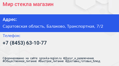 Мир стекла, магазин по адресу Саратовская область, Балаково, Транспортная, 7/2 в дальнейшем Организация, размещена в следующих категориях: