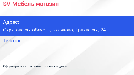 SV-Мебель, магазин по адресу Саратовская область, Балаково, Трнавская, 24 в дальнейшем Организация, размещена в следующих категориях: