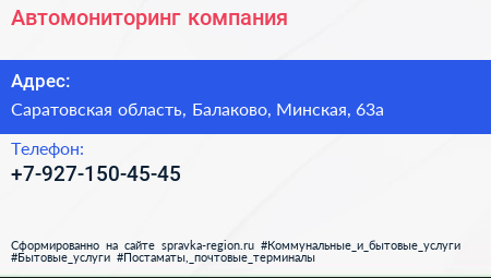 Автомониторинг, компания по адресу Саратовская область, Балаково, Минская, 63а в дальнейшем Организация, размещена в следующих категориях: