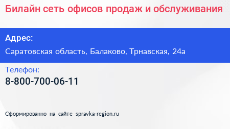 Билайн, сеть офисов продаж и обслуживания по адресу Саратовская область, Балаково, Трнавская, 24а в дальнейшем Организация, размещена в следующих категориях: