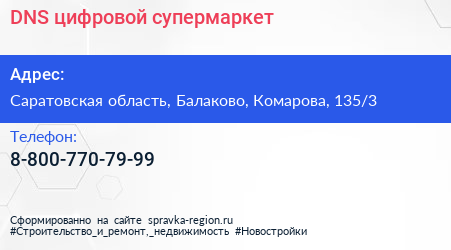 DNS, цифровой супермаркет по адресу Саратовская область, Балаково, Комарова, 135/3 в дальнейшем Организация, размещена в следующих категориях: