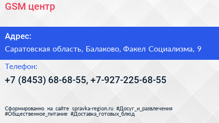 GSM-центр по адресу Саратовская область, Балаково, Факел Социализма, 9 в дальнейшем Организация, размещена в следующих категориях: