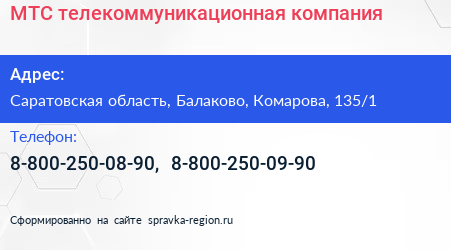 МТС, телекоммуникационная компания по адресу Саратовская область, Балаково, Комарова, 135/1 в дальнейшем Организация, размещена в следующих категориях:
