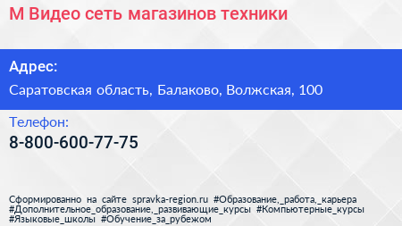 М.Видео, сеть магазинов техники по адресу Саратовская область, Балаково, Волжская, 100 в дальнейшем Организация, размещена в следующих категориях:
