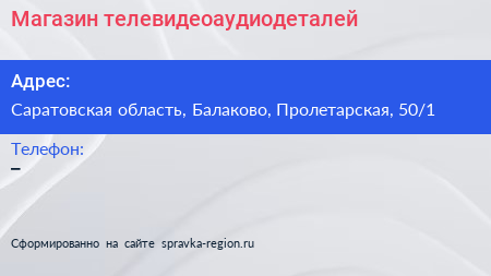 Магазин телевидеоаудиодеталей по адресу Саратовская область, Балаково, Пролетарская, 50/1 в дальнейшем Организация, размещена в следующих категориях: