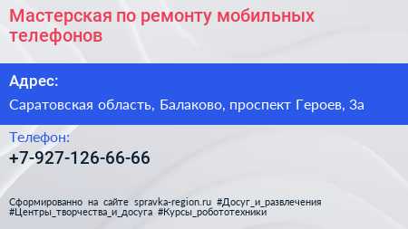 Мастерская по ремонту мобильных телефонов по адресу Саратовская область, Балаково, проспект Героев, 3а в дальнейшем Организация, размещена в следующих категориях: