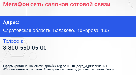МегаФон, сеть салонов сотовой связи по адресу Саратовская область, Балаково, Комарова, 135 в дальнейшем Организация, размещена в следующих категориях: