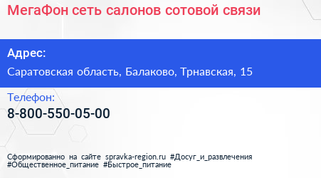 МегаФон, сеть салонов сотовой связи по адресу Саратовская область, Балаково, Трнавская, 15 в дальнейшем Организация, размещена в следующих категориях: