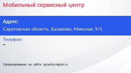 Мобильный сервисный центр по адресу Саратовская область, Балаково, Минская, 9/1 в дальнейшем Организация, размещена в следующих категориях: