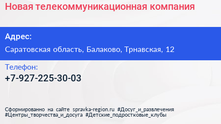 Новая телекоммуникационная компания по адресу Саратовская область, Балаково, Трнавская, 12 в дальнейшем Организация, размещена в следующих категориях: