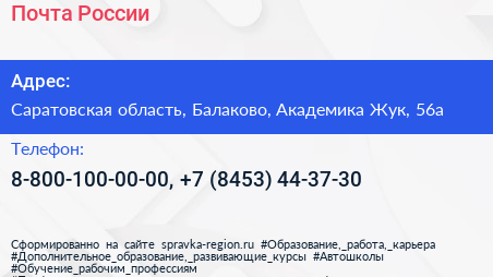 Почта России по адресу Саратовская область, Балаково, Академика Жук, 56а в дальнейшем Организация, размещена в следующих категориях: