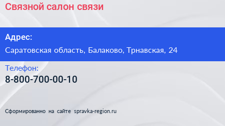 Связной, салон связи по адресу Саратовская область, Балаково, Трнавская, 24 в дальнейшем Организация, размещена в следующих категориях: