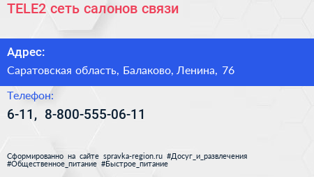 TELE2, сеть салонов связи по адресу Саратовская область, Балаково, Ленина, 76 в дальнейшем Организация, размещена в следующих категориях: