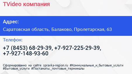 TVideo, компания по адресу Саратовская область, Балаково, Пролетарская, 63 в дальнейшем Организация, размещена в следующих категориях: