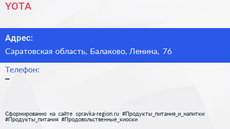 YOTA по адресу Саратовская область, Балаково, Ленина, 76 в дальнейшем Организация, размещена в следующих категориях: