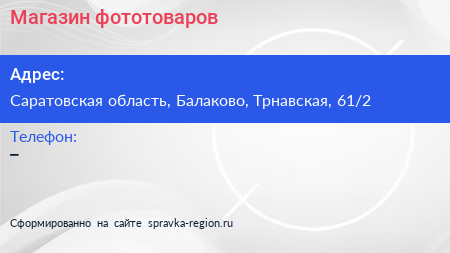 Магазин фототоваров по адресу Саратовская область, Балаково, Трнавская, 61/2 в дальнейшем Организация, размещена в следующих категориях: