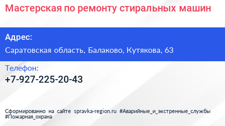 Мастерская по ремонту стиральных машин по адресу Саратовская область, Балаково, Кутякова, 63 в дальнейшем Организация, размещена в следующих категориях:
