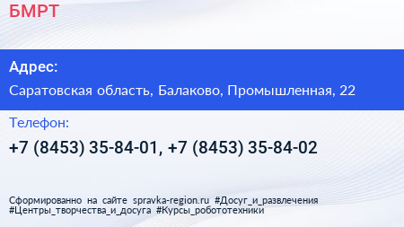 БМРТ по адресу Саратовская область, Балаково, Промышленная, 22 в дальнейшем Организация, размещена в следующих категориях: