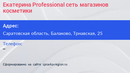 Екатерина Professional, сеть магазинов косметики по адресу Саратовская область, Балаково, Трнавская, 25 в дальнейшем Организация, размещена в следующих категориях: