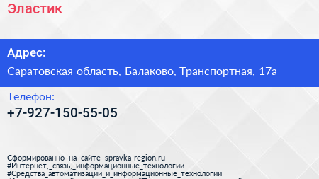 Эластик по адресу Саратовская область, Балаково, Транспортная, 17а в дальнейшем Организация, размещена в следующих категориях: