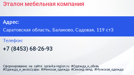 Эталон, мебельная компания по адресу Саратовская область, Балаково, Садовая, 119 ст3 в дальнейшем Организация, размещена в следующих категориях: