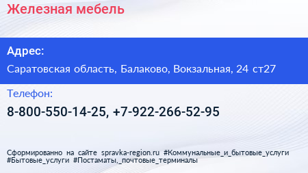 Железная мебель по адресу Саратовская область, Балаково, Вокзальная, 24 ст27 в дальнейшем Организация, размещена в следующих категориях: