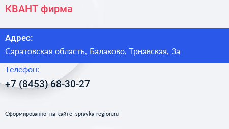 КВАНТ, фирма по адресу Саратовская область, Балаково, Трнавская, 3а в дальнейшем Организация, размещена в следующих категориях: