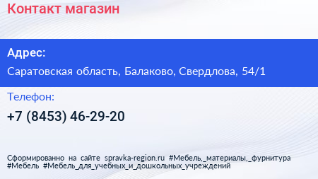Для связи с организацией воспользуйтесь номером телефона: +7 (8453) 46-29-20. Пн: c 09:00-18:00, Вт: c 09:00-18:00, Ср: c 09:00-18:00, Чт: c 09:00-18:00, Пт: c 09:00-18:00, Сб: c 09:00-14:00, Вс: c 09:00-14:00, вы можете обратиться в эту организацию.