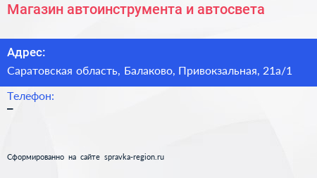 Магазин автоинструмента и автосвета по адресу Саратовская область, Балаково, Привокзальная, 21а/1 в дальнейшем Организация, размещена в следующих категориях: