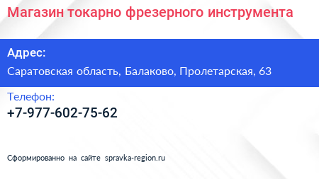 Магазин токарно-фрезерного инструмента по адресу Саратовская область, Балаково, Пролетарская, 63 в дальнейшем Организация, размещена в следующих категориях: