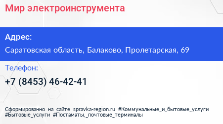 Мир электроинструмента по адресу Саратовская область, Балаково, Пролетарская, 69 в дальнейшем Организация, размещена в следующих категориях: