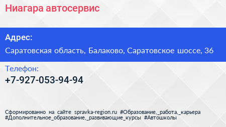 Ниагара, автосервис по адресу Саратовская область, Балаково, Саратовское шоссе, 36 в дальнейшем Организация, размещена в следующих категориях: