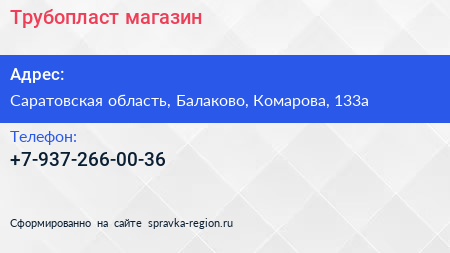 Трубопласт, магазин по адресу Саратовская область, Балаково, Комарова, 133а в дальнейшем Организация, размещена в следующих категориях: