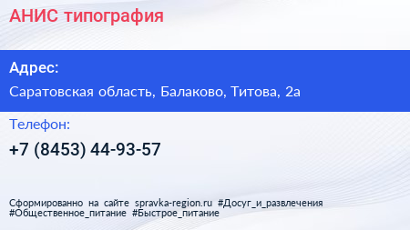 АНИС, типография по адресу Саратовская область, Балаково, Титова, 2а в дальнейшем Организация, размещена в следующих категориях: