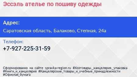 Эссэль, ателье по пошиву одежды по адресу Саратовская область, Балаково, Степная, 24а в дальнейшем Организация, размещена в следующих категориях: