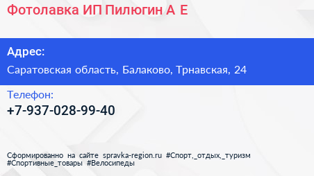 Фотолавка, ИП Пилюгин А.Е. по адресу Саратовская область, Балаково, Трнавская, 24 в дальнейшем Организация, размещена в следующих категориях: