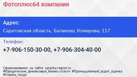 Фотоплюс64, компания по адресу Саратовская область, Балаково, Комарова, 117 в дальнейшем Организация, размещена в следующих категориях: