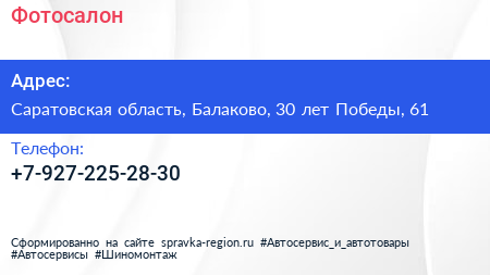 Фотосалон по адресу Саратовская область, Балаково, 30 лет Победы, 61 в дальнейшем Организация, размещена в следующих категориях: