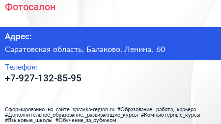Фотосалон по адресу Саратовская область, Балаково, Ленина, 60 в дальнейшем Организация, размещена в следующих категориях: