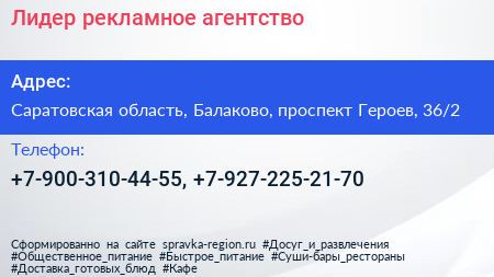 Лидер, рекламное агентство по адресу Саратовская область, Балаково, проспект Героев, 36/2 в дальнейшем Организация, размещена в следующих категориях: