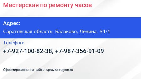 Мастерская по ремонту часов по адресу Саратовская область, Балаково, Ленина, 94/1 в дальнейшем Организация, размещена в следующих категориях:
