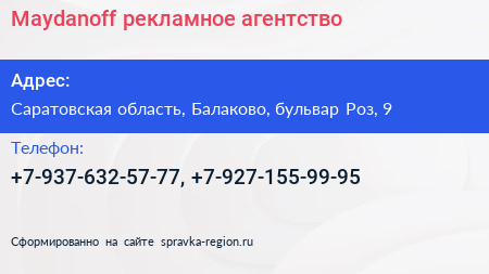 Maydanoff, рекламное агентство по адресу Саратовская область, Балаково, бульвар Роз, 9 в дальнейшем Организация, размещена в следующих категориях: