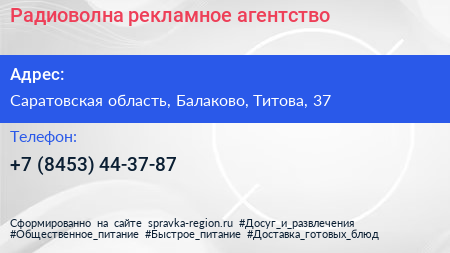 Радиоволна, рекламное агентство по адресу Саратовская область, Балаково, Титова, 37 в дальнейшем Организация, размещена в следующих категориях: