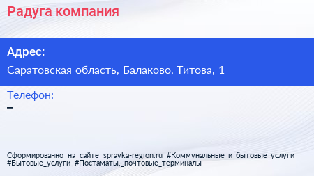Радуга, компания по адресу Саратовская область, Балаково, Титова, 1 в дальнейшем Организация, размещена в следующих категориях: