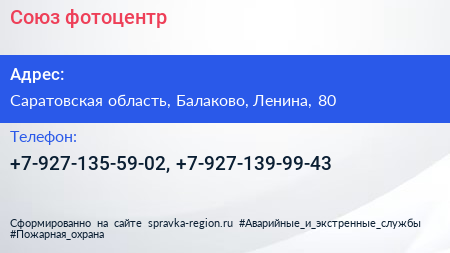 Союз, фотоцентр по адресу Саратовская область, Балаково, Ленина, 80 в дальнейшем Организация, размещена в следующих категориях: