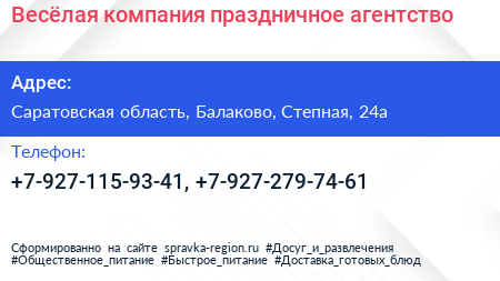Весёлая компания, праздничное агентство по адресу Саратовская область, Балаково, Степная, 24а в дальнейшем Организация, размещена в следующих категориях: