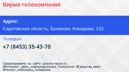 Вирма, телекомпания по адресу Саратовская область, Балаково, Комарова, 152 в дальнейшем Организация, размещена в следующих категориях: